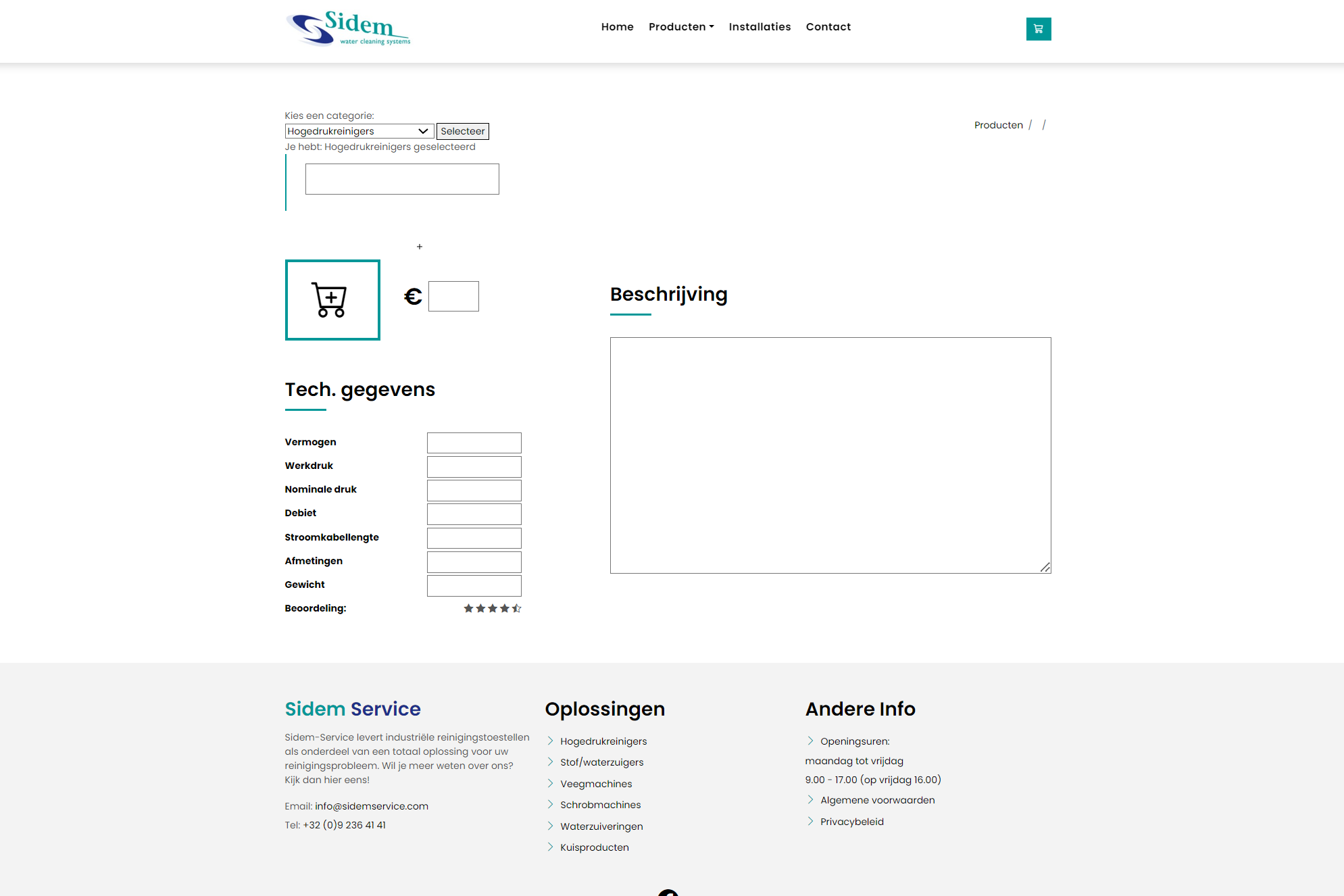 Wij hebben een modern, professioneel ontwerp ontwikkeld dat aangepast is aan hun huisstijl. De nieuwe website heeft een aantrekkelijke startpagina die producten in de spotlight zet, een uitgebreid productoverzicht en een gebruiksvriendelijk beheerpaneel waarmee Sidem Service zelf productdetails kan aanpassen. Daarnaast is er een contactpagina opgenomen voor klanten om eenvoudig vragen te stellen of offertes aan te vragen. Toekomstige plannen omvatten de presentatie van hun waterzuiveringsinstallaties. Echter, vanwege drukte heeft Sidem Service nog niet alle producten kunnen toevoegen, waardoor sommige delen van de website nog “under construction” zijn.